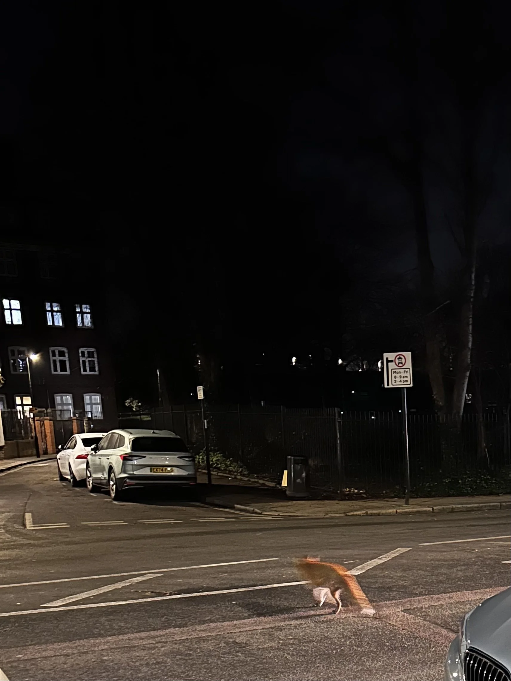 Nighttime street scene with parked cars and a blurred fox crossing the road.